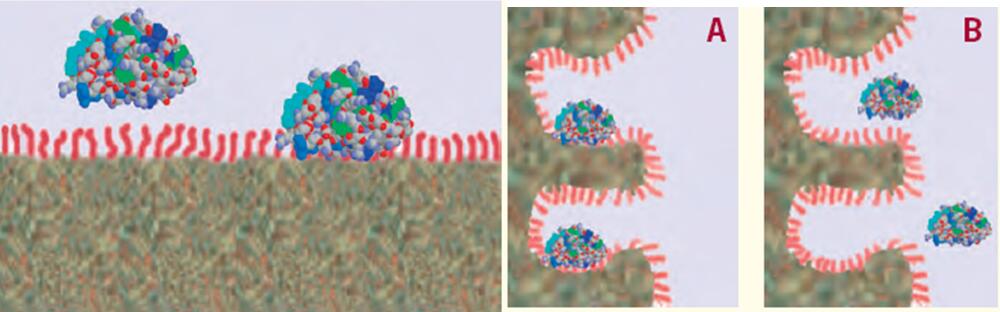 大部分蛋白質(zhì)位于表面上方與流動(dòng)相接觸(蛋白質(zhì)的大部分是在疏水面之上與流動(dòng)相接觸)。