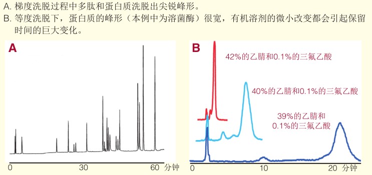 在RP-HPLC中,蛋白和多肽的保留和一般的小分子化合物有所不同,等度洗脫對(duì)于蛋白質(zhì)的分離作用很小,有機(jī)相比例小的變化會(huì)引起蛋白質(zhì)保留的大的變化。