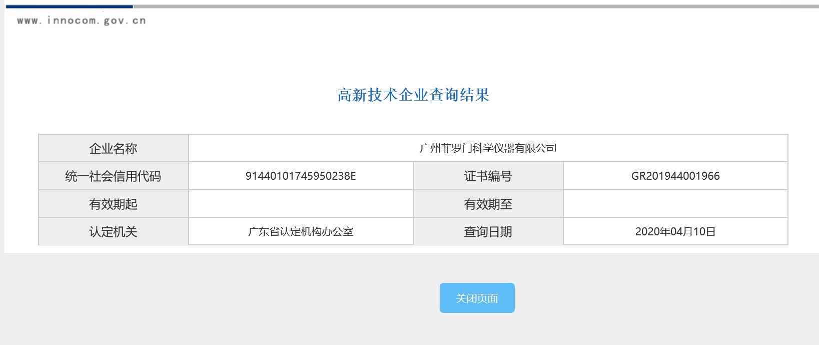 根據(jù)國(guó)家《高新技術(shù)企業(yè)認(rèn)定管理辦法》和《高新技術(shù)企業(yè)認(rèn)定管理工作指引》的相關(guān)規(guī)定,廣州菲羅門科學(xué)儀器有限公司被認(rèn)定為國(guó)家級(jí)高新技術(shù)企業(yè)。 菲羅門高新企業(yè)證書(shū)編號(hào):GR201944001966