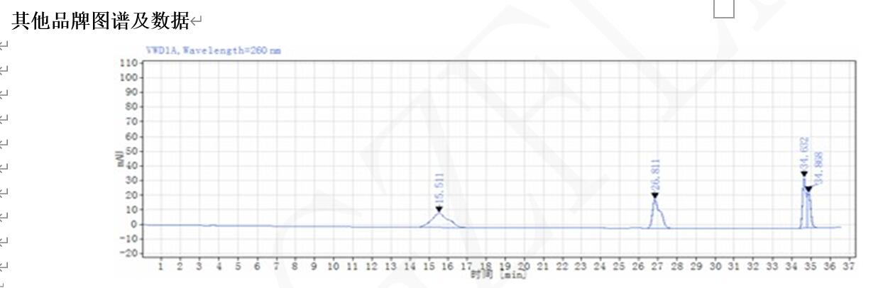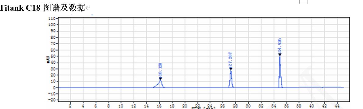 而本方法中更是使用了 100%水相 ,使用 TitankC18 與其他品牌色譜柱對比,發(fā)現(xiàn) TitankC18 色譜柱峰型及壽命 優(yōu) 于 其 他 品 牌 色 譜 柱 。 該 流 動(dòng) 相 體 系 適 合 轉(zhuǎn) 換 成 LC-MS 檢 測 。