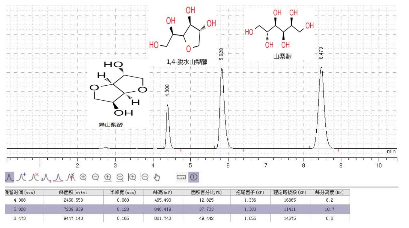 方法說明:使用 Comixsil HCS 可以較好分離山梨醇、異山梨醇、1,4-脫水山梨醇,方法存在調(diào)整空間大, 該等度洗脫方法可適用于 RID。