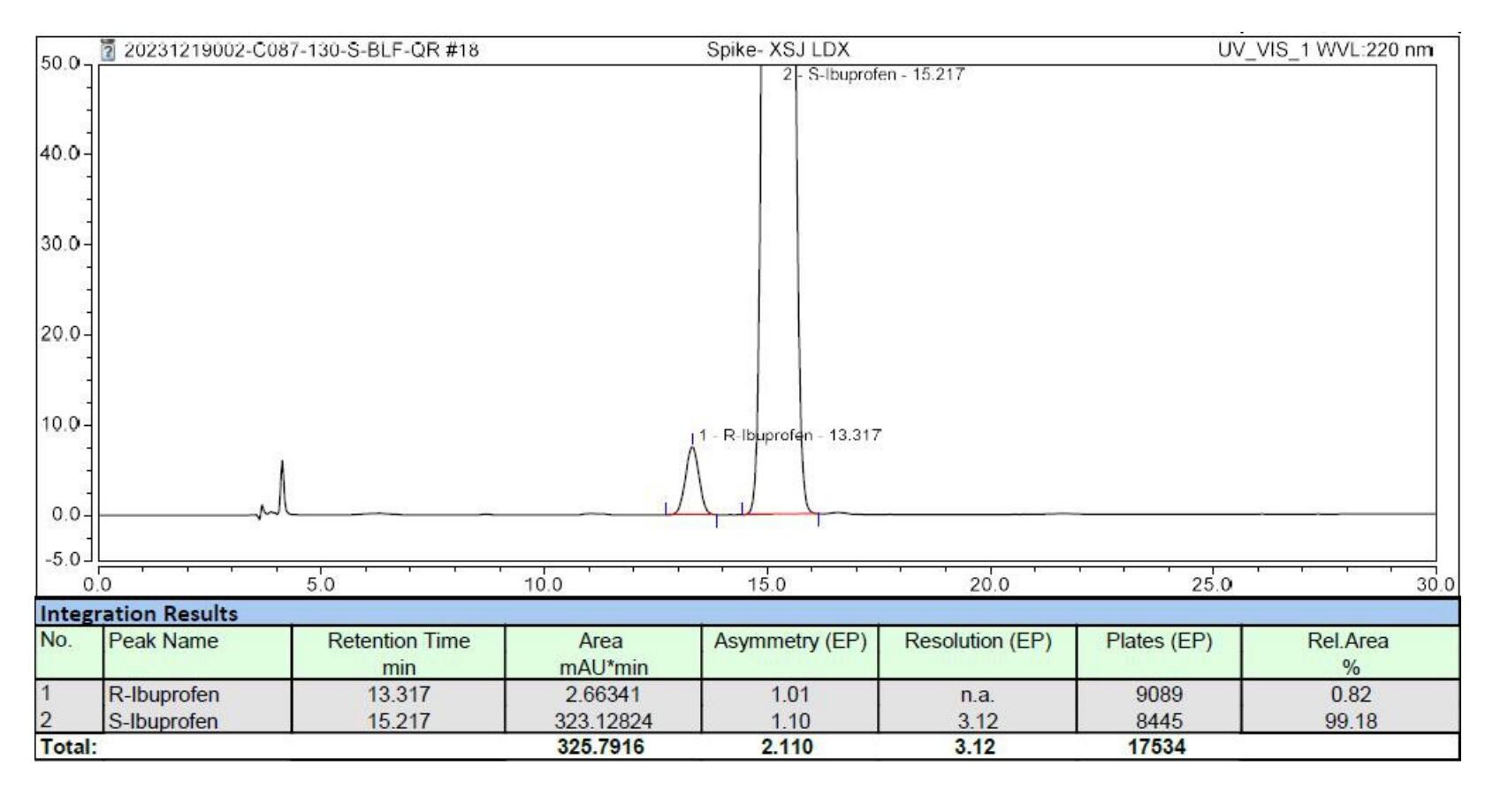 評語:該款反相手性色譜柱相比藥典的正相方法,采用簡單的反相流動相體系,更為實用方便。峰形對稱, 柱效高。藥典要求理論板數(shù)按右布洛芬峰計算不低于 2000,右布洛芬峰與左布洛芬峰之間的分離度應大于