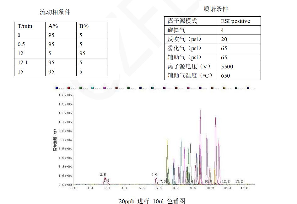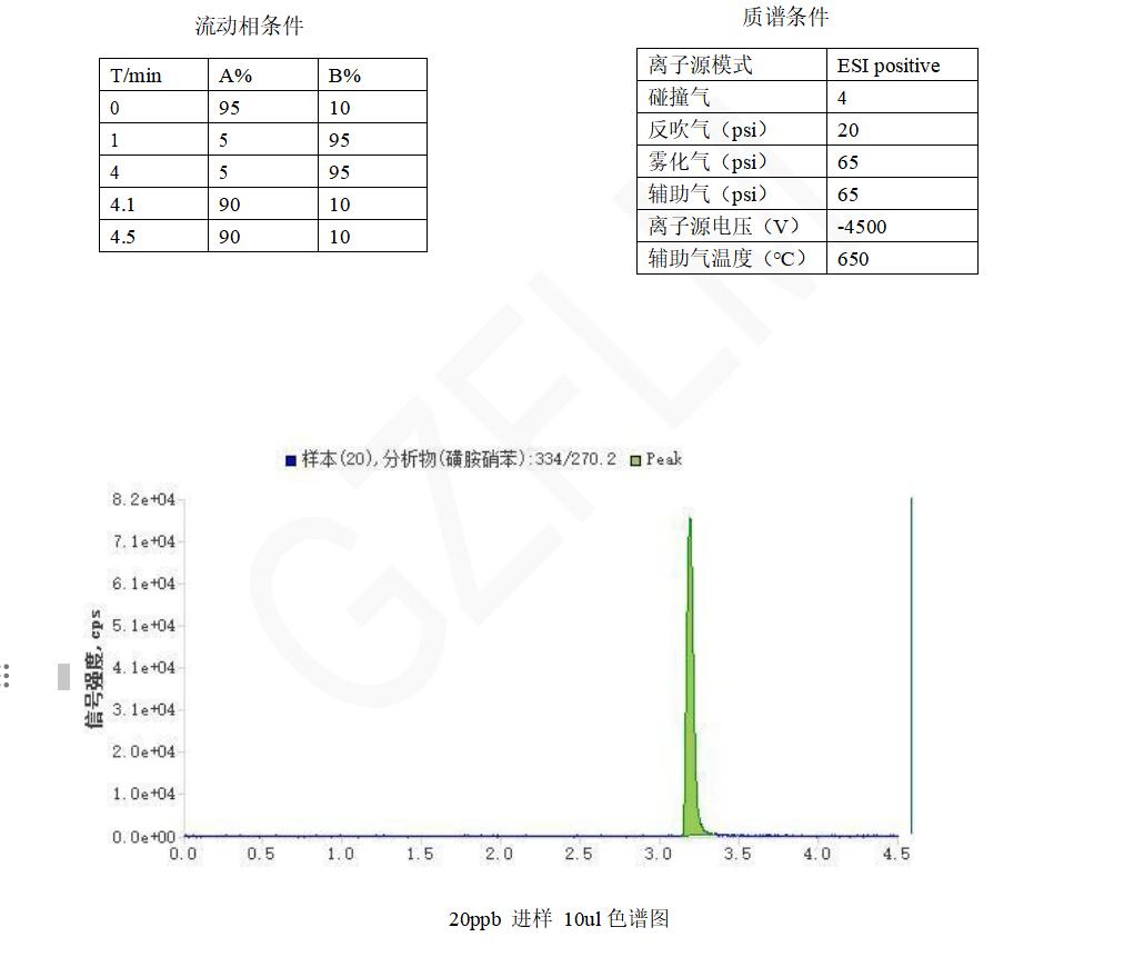 App ID:FLM-T240005 磺胺脒、磺胺醋酰、磺胺嘧啶等 23 種磺胺測定 色譜柱:Titank C18 1.8u 100*2.1mm( FMD-5558-BONU) 流動相 A:0.1%甲酸水 流動相 B:甲醇流速:0.25ml/min 進(jìn)樣體積:10μl 柱溫: 35℃ 儀器: 廣州質(zhì)譜技術(shù)有限公司 LCMS-TQ480 三重四極桿串聯(lián)質(zhì)譜儀; 廣州質(zhì)譜技術(shù)有限公司 UPLC-480 超高效液相儀; 標(biāo)準(zhǔn)物質(zhì):磺胺 23 項混標(biāo):包含磺胺脒、磺胺醋酰、磺胺嘧啶、磺胺二甲嘧啶、磺胺索嘧啶、磺胺噻唑、磺胺吡啶、磺胺甲嘧啶、磺胺甲氧嗪、甲氧芐啶、磺胺甲二唑、磺胺對甲氧嘧啶、磺胺氯噠嗪、磺胺甲惡唑、磺胺間甲氧嘧啶、磺胺多辛、磺胺異惡唑、磺胺惡唑、磺胺苯酰、磺胺苯吡唑、磺胺間二甲氧嘧啶、磺胺喹 惡啉、磺胺硝苯,由甲醇配制,濃度為 1ppm;磺胺 22 種(正離子模式)