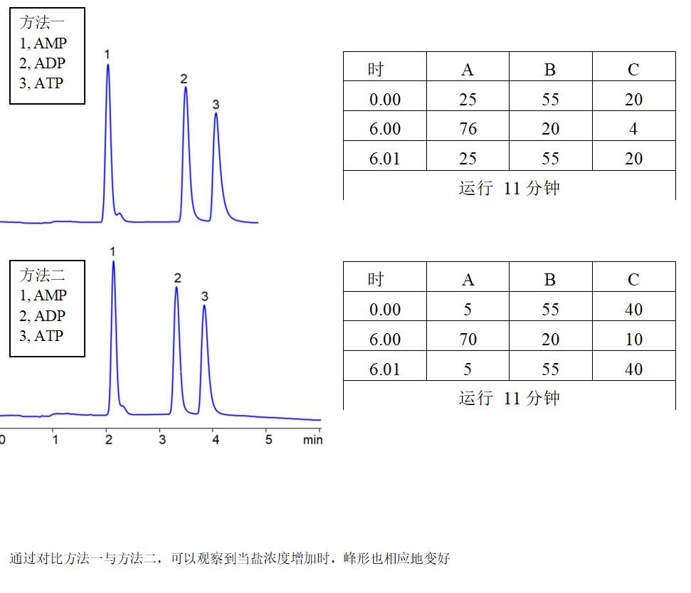 2. **流動(dòng)相**: - 流動(dòng)相的選擇對(duì)分離效果至關(guān)重要。對(duì)于AMP、ADP和ATP的分離,常用的流動(dòng)相可能包括磷酸鹽緩沖液和有機(jī)溶劑(如甲醇或乙腈)的混合物。流動(dòng)相的pH值和離子強(qiáng)度也需要仔細(xì)調(diào)整,以獲得最佳的分離效果。