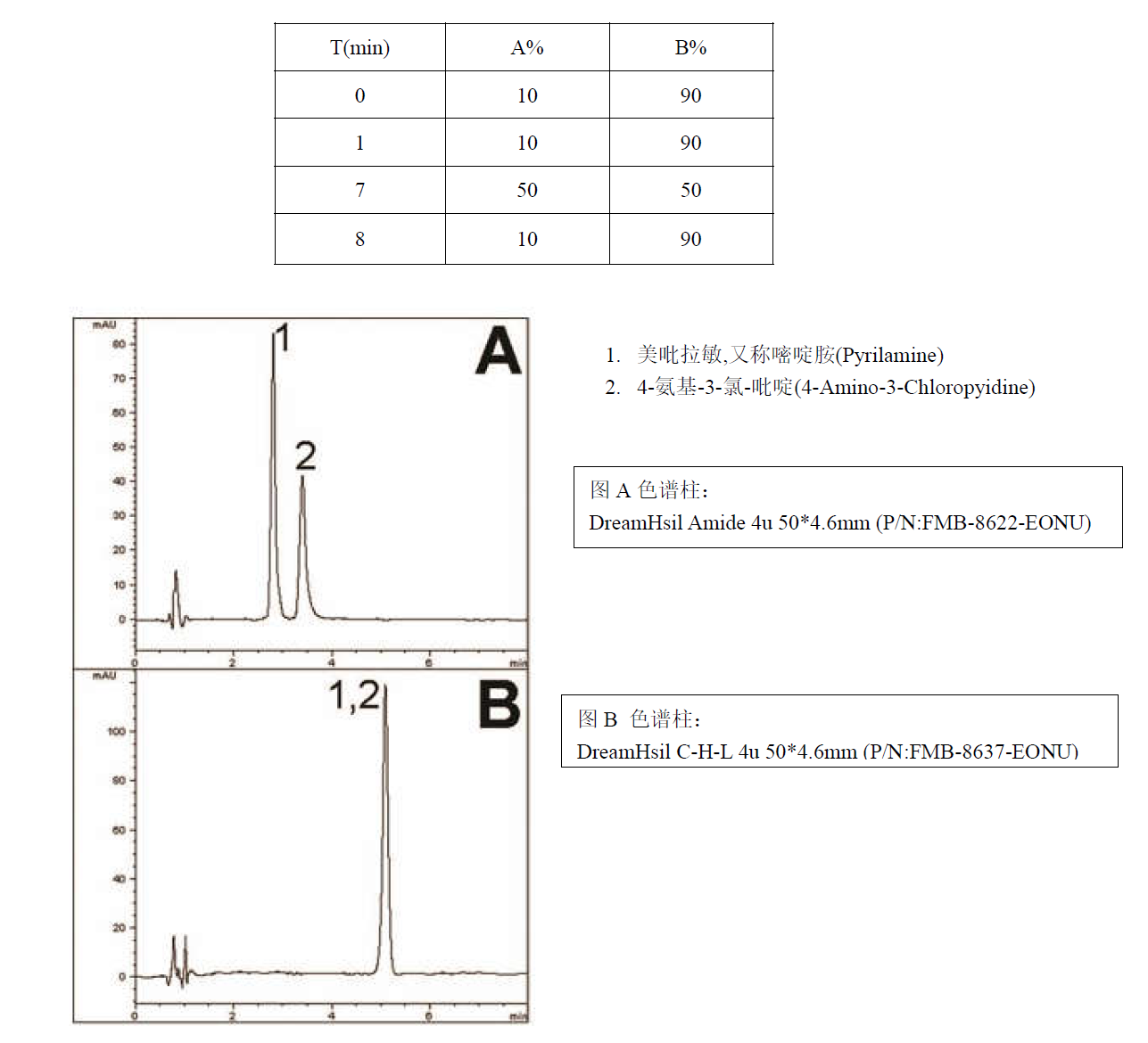 App ID: FLM-D260017 DeramHsil Amide 柱分析4-氨基-3-氯-吡啶與美吡拉敏(MS 檢測器適用) 色譜柱:DreamHsil Amide 4u 50*4.6mm (P/N:FMB-8622-EONU) 流動相: A: 90%水+10%乙腈(含0.1%甲酸) B: 乙腈(含0.1%甲酸) 流速:1ml/min 檢測器:UV 244nm