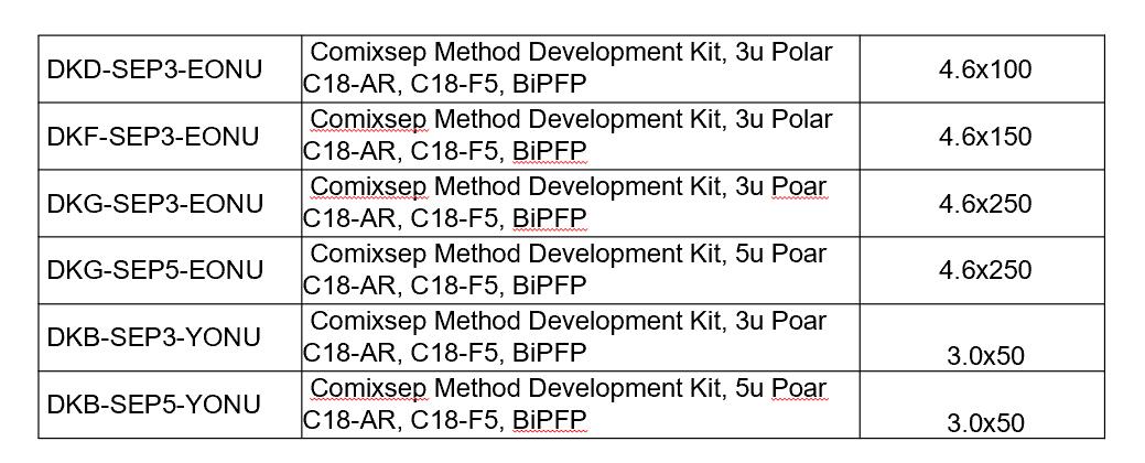 Comixsep復合反相固定相方法包為三款規格一致的互補固定相(Polar C18-F5, Polar C18-AR和Polar BiPFP)的組合,通過選擇性的科學互補,方便在HPLC方法開發時固定相的篩選,最大化提升方法開發的效率和成功率,是HPLC方法開發的有力工具。