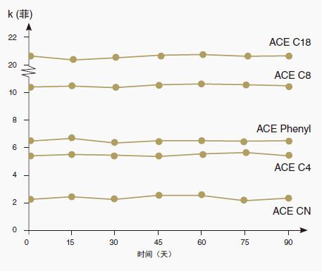 由于使用超高純度的硅膠固定載體粒子以及鍵合相的極高表面覆蓋,ACE鍵合相表現出極高的穩定性。(參見圖9)