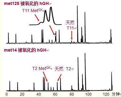 如圖36所示,含氧化甲硫氨酸的多肽比含天然甲硫氨酸的多肽出峰時間早很多。